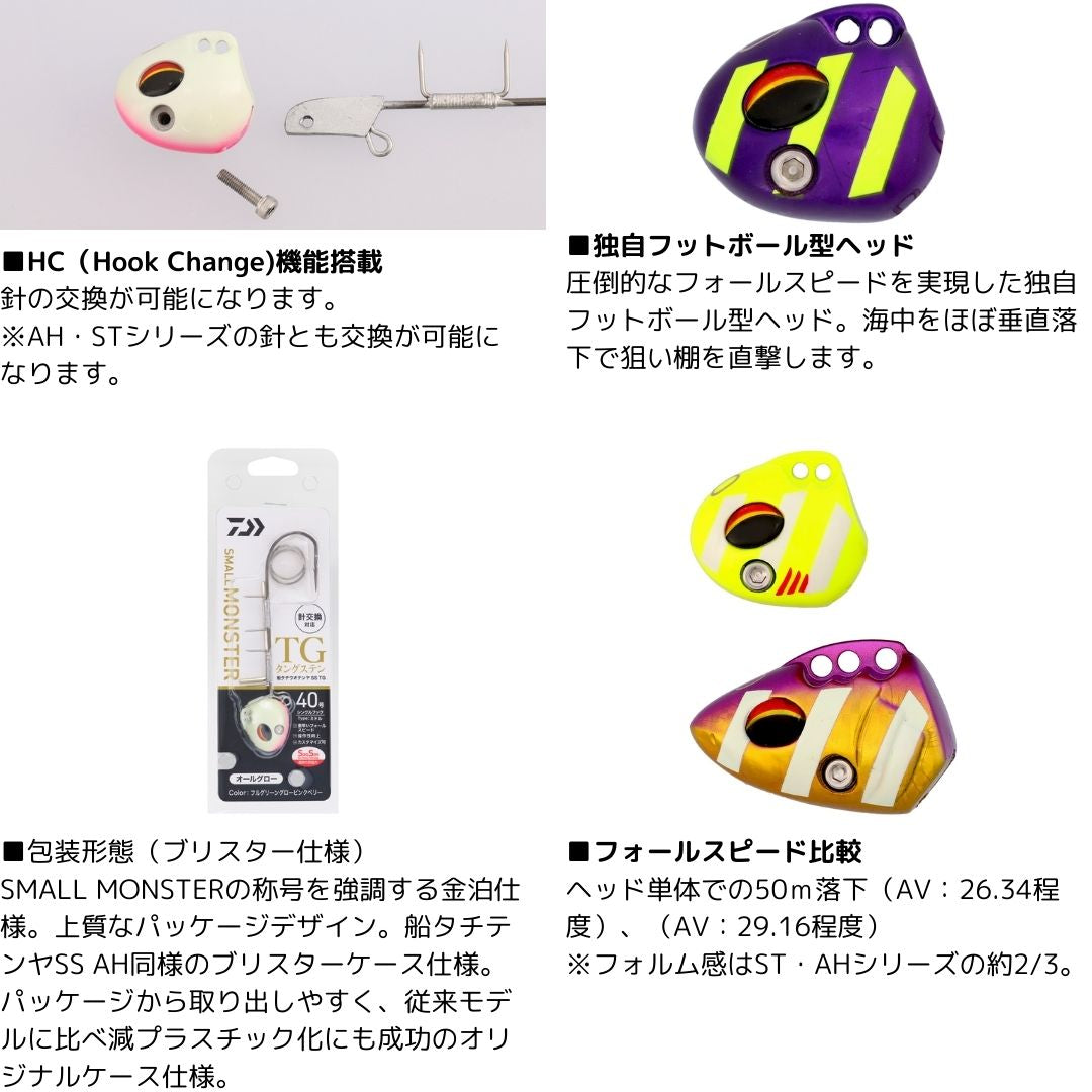 高比重タングステン素材を使用し、ヘッド部分を大幅にコンパクト化。素早いフォールスピードや水切れも良く、持ち重りが軽く操作性が向上。ミドルフック標準搭載に加え、針のベンド部分に平打ち加工を施したことでさらに刺さり、強度が向上。姿勢変化も自由自在の2点ハンガー機能。ヘッドと針の取り外しが可能でカスタマイズ性向上。HC(Hook Change)機能搭載で、AHシリーズの針とも交換が可能。オモリウエイト40号の1サイズ、6カラー展開で全アイテムにサクサスフック搭載。針はミドルサイズ(TGではノーマル表示)で、AHやSTシリーズでも採用されているサイズ。