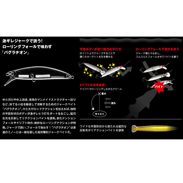 背中のナイフエッジ形状は水を切り裂く効果があり、ジャーキング操作が素早くルアーのアクション始動への伝達するレスポンスの良さがある。ただ巻きでの強波動はリアクションバイトを誘発し、明暗の境を早巻きで巻くことにより堪らず魚が口を使ってしまう。通称”バグる”が最後の切り札となる。