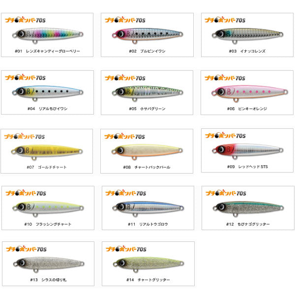 外洋ショアゲームにおいて今まで小型ルアーが敬遠されてきた理由は明確。1.飛距離が出ない  2.ボディー強度不足 3.搭載フック強度が低い 従来の小型ルアーの3つのデメリットを全て解消。それだけに止まらずフィッシュイーター達を狂わせる最高の食わせアクションを実現したのがプチボンバー70Sである。70mmの小型ボディーでありながら常識外れの貫通ワイヤー構造と潰れに強いジャンプライズ剛性ボディー設計を採用。そして外洋でも通用する十分な飛距離。また、外洋だけでなく干潟、河川、汽水湖のシーバスゲームにも完全対応。通常仕様では飛距離を生かしたスローリトリーブドリフト釣法の細かいロールスウィングアクションで魚を引き出す事が出来る。詰まりに詰まった次世代の70mmがここに誕生!