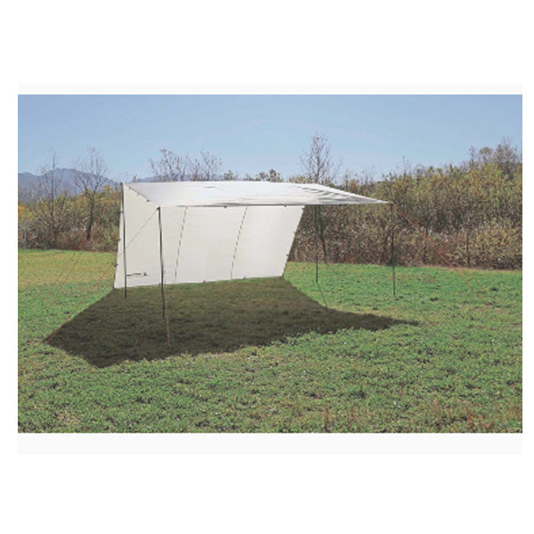 ポールを2本使用し、両サイドを下げてロープでテンションを掛ければウイングタープのように使えます。