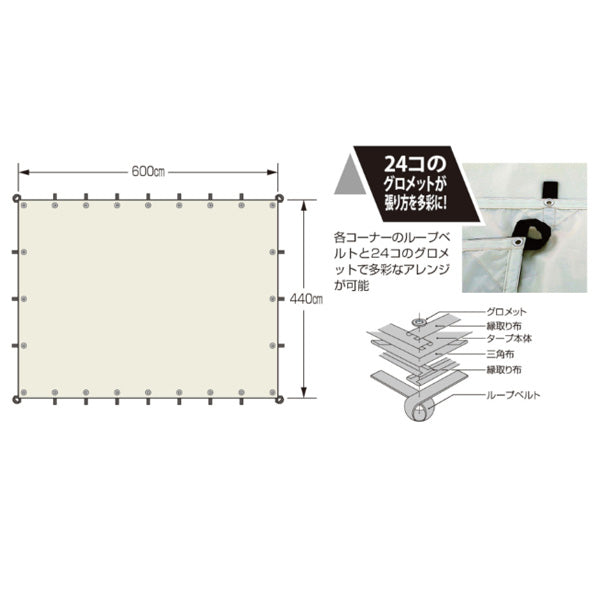 大人数で使用でき、24個のグロメットとポールのアレンジで多彩なセッティングが可能なシンプルで自由度の高いスクエアタープです!