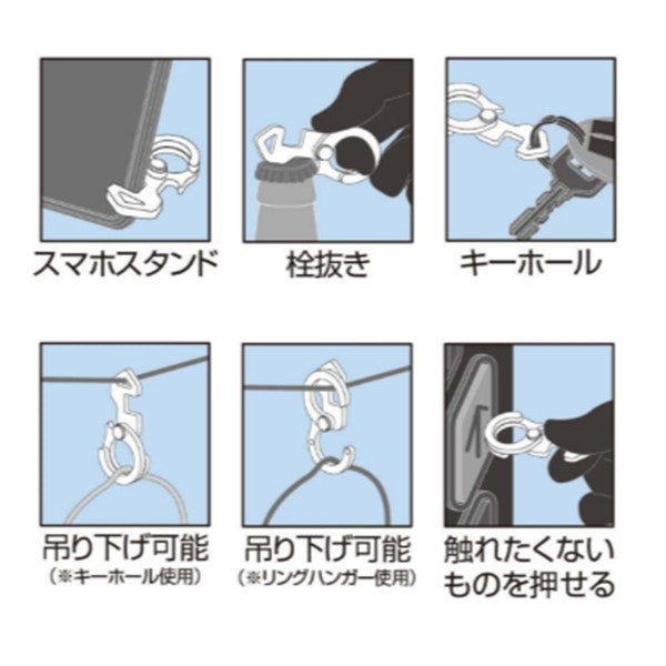 機能/スマホスタンド、栓抜き、キーホール、吊り下げ可能(※吊り下げ使用orリングハンガー使用)、触れたくないものを押せる。