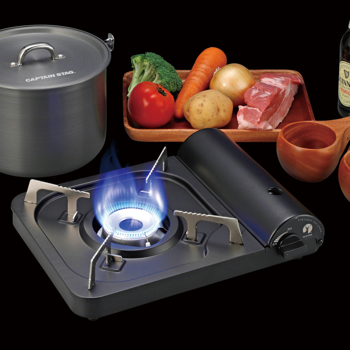 薄型・軽量で持ち運び楽々、コンパクトなカセットコンロ。