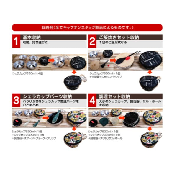 <仕様/その他> 外径140×高さ60mm、容量630ml程度のシェラカップ4個程度を収納できます。※形状などにより収納できない場合がございます。