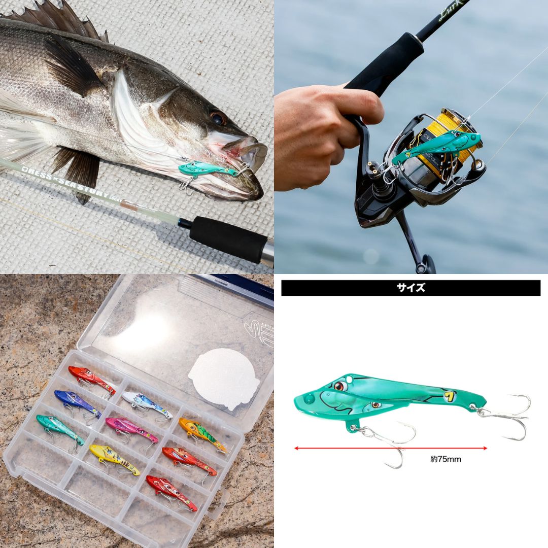 海物語をモチーフにしたデザインのルアーです。独特の柔らかいアクションから生まれる微波動が絶対的な効果を発揮します。水深1m以下の河川でのシャローエリアから沖堤防まで攻略可能です。鉄板系バイブにありがちな引き抵抗もほとんどなく、浮き上がりを抑えたボディでレンジコントロールと水平姿勢でのスイミング性能を各フィールドでストレスなく使用できます。超ハイスピードリトリーブにも完全対応します。フックポジションを下げることで低重心化し安定感を生み出し、ジャークやリフト&フォール、ベイトにコンタクトした際のトラブルを極限まで低減します。スナップアイは楕円形状を採用し、様々なスナップでの装着が容易に行えます。