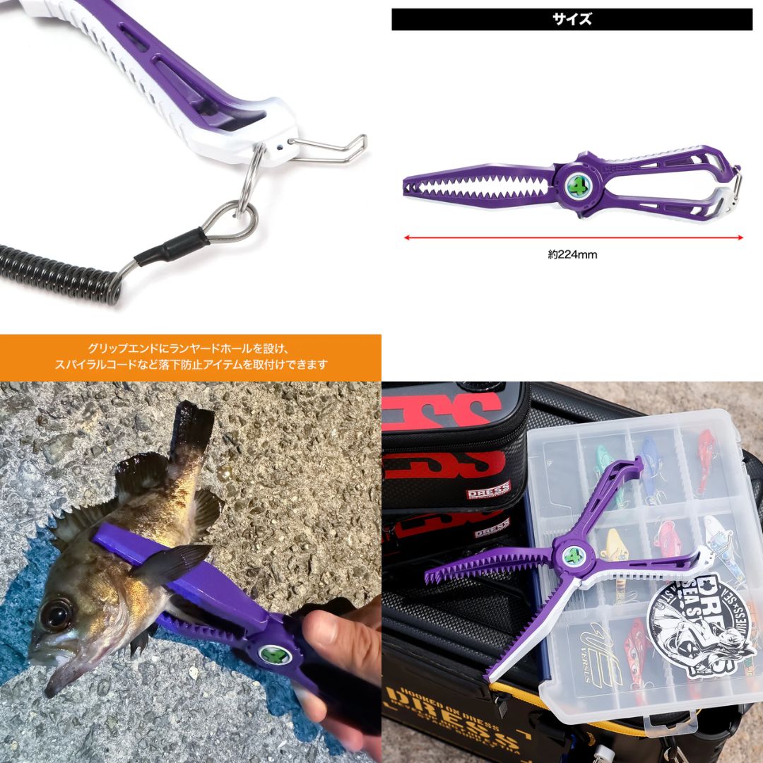 ※品質には万全を期しておりますが、ご使用前に破損がないか確かめてください。万一、不具合があった場合は使用しないでください。※部品の角やバリ等による怪我、間違った使用による破損及び事故等には当社は責任を負いませんので注意してお取扱いください。※間違った使用による破損や、本製品ご使用中に発生した事故等には当社は責任を負いませんので注意してお取扱いください。※作動不良をおこす場合がありますので、ご使用後は真水で洗い風通しの良い日陰で十分に乾燥させてください。※可動部には定期的に注油を行ってください。怠ると作動不良等、故障の原因となりますのでご注意ください。※火気のそばや真夏の車内など、高温所に放置すると変形する恐れがあります。※本製品片側の白色部は塗装で、両面の④部はシールです。ご使用状況や経年劣化により剝がれや変色する場合があります。ご了承ください。※製造上、本体生地に小傷が付く場合や塗装ズレが生じる場合があります。※本体に強い衝撃を与えると、変形や破損の恐れがあります。※落下を防止する場合はエンドロープをご使用ください。※魚を掴む牙は鋭く危険です。手など挟まないようご注意ください。※小型魚専用のフィッシュグリップです。大型魚を無理に掴むと破損する恐れがあります。※保管の際は小さなお子様の手の届かない所へ保管してください。※本製品は分解できません。