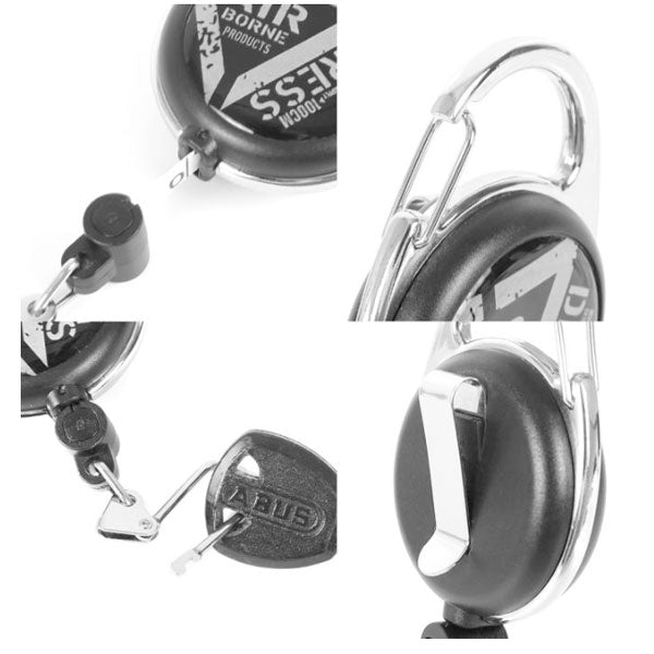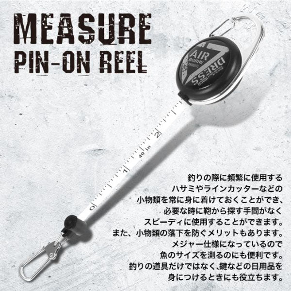●メジャー内蔵カラビナ付きピンオンリール●フィッシングツールの携帯・紛失防止に最適●最大計測1000mm●裏面ベルトクリップ搭載 釣りの際に頻繁に使用するハサミやラインカッターなどの小物類を常に身に着けておくことができ、必要な時に鞄から探す手間がなくスピーディに使用することができます。また、小物類の落下を防ぐメリットもあります。メジャー仕様になっているので魚のサイズを測るのにも便利です。釣りの道具だけではなく、鍵などの日用品を身につけるときにも役立ちます。