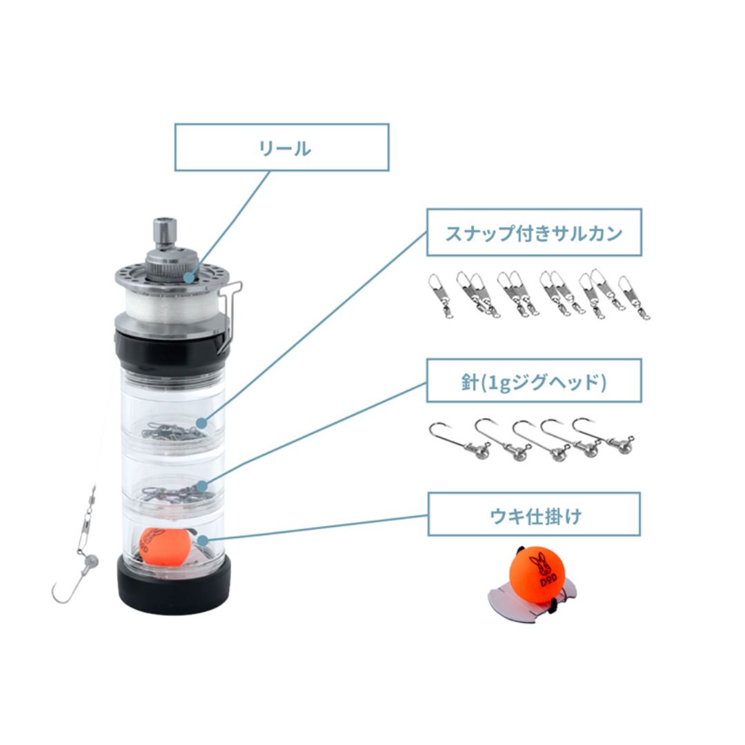 セット内容 製品本体、8lbナイロンライン80m(本体リールに取付済)、スプールバンド(本体リールに取付済)、針(1gジグヘッド×5、本体ボトル内部に在中)、ウキ仕掛け(本体ボトル内部に在中)、スナップ付きサルカン×11(うち1点はラインに取付済、10点はボトル内部に在中)
