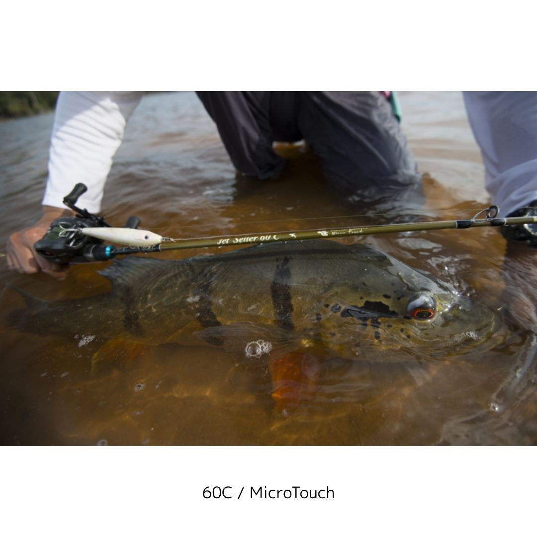 ジェットセッターというパックロッドは、世界中の中型クラスの魚を釣るため、汎用性をあげたバーサタイルロッドシリーズです。特に、この60Cマイクロタッチは、ベイトフィネスというカテゴリーに属するモデルで、使用する軽量なスプーンやスピナー、またペンシルベイトやミノーなど速く細かな動きを必要とするルアーを得意とします。仕舞い寸法は50cmを専用ケースに。