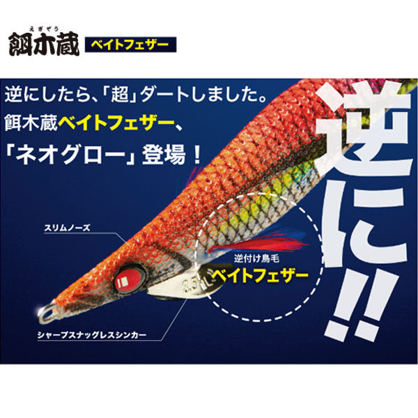 ベイトフェザー 餌木博士こと薗田氏デザインの逆付け鳥毛の餌木蔵「ベイトフェザー」シリーズ登場。ベイト(小魚)の胸ヒレをイミテートした逆付け「ベイトフェザー」は、シャクリ時の抵抗を最大限に抑えることで、軽快なキレッキレダートアクションの演出が可能!さらに飛行姿勢にも逆付け効果が大きく、空気抵抗が軽減し飛距離もUPしました。そしてシンカー形状も水の抵抗を極力抑えたキレッキレアクションの専用設計、更に飛距離UPに加え根掛かりしにくいデザイン形状です。