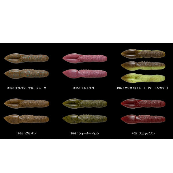 高比重ワーム「ヘビープープ」に、スレバスに効く3インチサイズが登場。 琵琶湖シモタケガイドプロデュースの高比重ワーム「ヘビープープ」に3インチサイズが登場。マッチ ザ ベイトを意識したボリュームでフィールドを選ばないサイズに仕上がりました。また小さくなったことで、リングビアウォーレイのすり抜けもよくなり、ミスバイトが激減。針持ちの良さと、比重を両立させたソルト30%配合のマテリアルを使用しながら、11gのウエイトを確保することで、3.6”と同じタックルで使用可能。フォール時にしっかりと水平フォールすることや、ソフトジャークでもしっかりとダートしアピールできるデザインです。爪部分の深い溝は3.6”と同じように水を流し、回収時に回転しずらくなっており、糸ヨレのストレスを軽減してくれます。