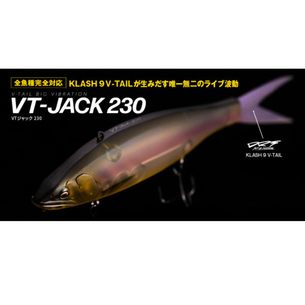 【全魚種完全対応】KLASH 9 V-TAILが生みだす唯一無二のライブ波動 キレの良い水平姿勢ロールアクションとほど良い巻き心地にこだわったVT-JACK230はあらゆるフィッシュイーターをターゲットとしたフローティングビッグバイブレーションプラグです。DRT・KLASH 9 V-TAILを搭載したことでよりベイトフィッシュに近い唯一無二のライブ波動を生み出します。