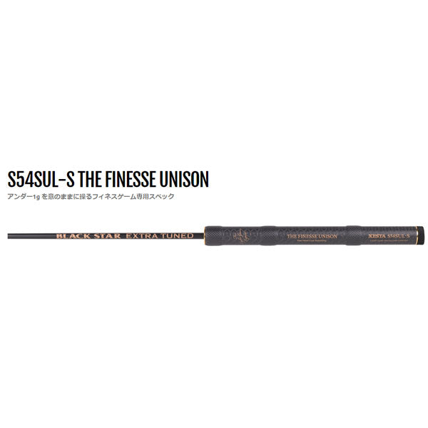 驚愕の軽さと感度 常識を覆す「エクストラチューンド」 堂々の追加ラインナップ ライトゲームロッド「ブラックスター」ブランドの最高峰に君臨する「エクストラチューンド」。生産現場泣かせとも言える「攻めた」造り込みはライトゲームの究極形とも言える。2022年秋、「フィネス」をテーマに掲げたS54SUL-SとS55UL/L-Sが追加。ブランクスは最新素材「トレカT1100G」を採用し超細身に巻き上げ、絶妙なしなりとハリの調和を実現。キャスト時やロッドワーク中のブレを一切感じさせない操作感は感動の一言だ。グリップは他に前例のない超軽量カーボン樹脂素材のリールシートをカーボンテープで高密度4軸カーボンシャフトに装着し究極のSWライトフィネスゲーム専用グリップを構築。必要最小限のグリップ長はワンハンドキャストを主とするライトゲームにおいて圧倒的なアドバンテージをもたらし持つ者を驚愕させる。「狙って釣る」というフィネスゲームの境地にさらに近づくことを可能とするモデルがここに誕生。S54SUL-S THE FINESSE UNISON アンダー1g を意のままに操るフィネスゲーム専用スペック ライトリグの操作性をティップの入り込みを重視したフィネスゲーム専用ロッド。特にリグを細かく操作した後のラインテンションのコントロール性能に長け、瞬間的な抜けアタリや追尾をしなやかかつ高感度30tソリッドティップが手元に伝える。わずかな違和感を掛けるだけでなく瞬間的な反転バイトも弾くことなく乗せることができる。激戦区で頼りになるフィネスゲームの王道となるモデル。