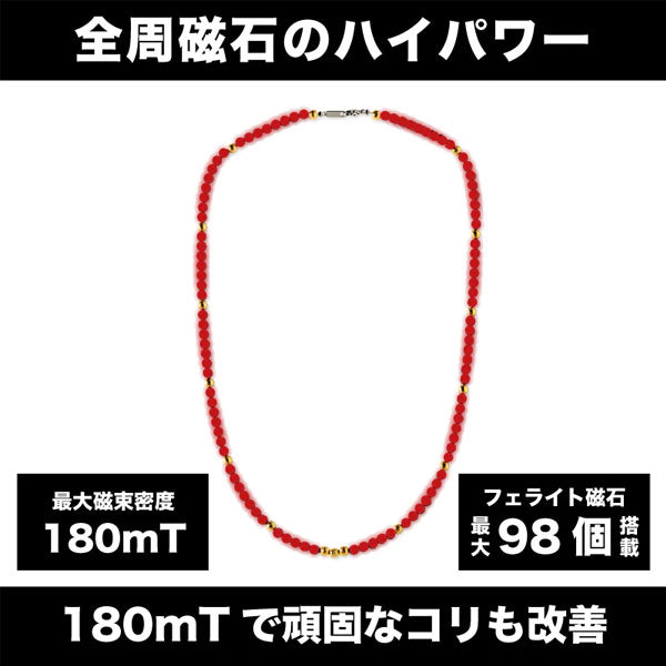 サイズに応じて95粒または115粒のビーズが連なる煌びやかなジュエリーのような見た目でありながら、最大磁束密度180mTの強力な磁力が首・肩のこりの緩和と血行の促進に作用する管理医療機器認証を取得した永久磁石磁気治療器です。メイドインジャパンならではの丁寧な手仕事で仕上げられるGalaxyシリーズには、美しさと機能性が共存しています。