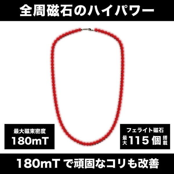 サイズに応じて95粒または115粒のビーズが連なる煌びやかなジュエリーのような見た目でありながら、最大磁束密度180mTの強力な磁力が首・肩のこりの緩和と血行の促進に作用する管理医療機器認証を取得した永久磁石磁気治療器です。メイドインジャパンならではの丁寧な手仕事で仕上げられるGalaxyシリーズには、美しさと機能性が共存しています。
