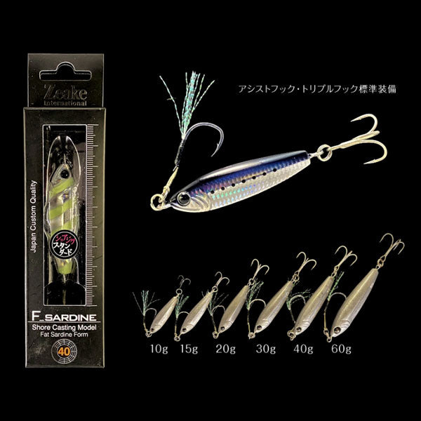 弾丸ぶっ飛び小型ナチュラルシルエット ※アシストフック・トリプルフック標準装備 Fサーディン(ファット、サーディン)は、弾丸の様なファットなシルエットと左右対称のセンター後方ウエイトバランスにより、空気抵抗を軽減し安定した飛距離を実現。フォール時は平打ちフォールでターゲットを魅了。リーリング時ストレスの少ないロッドワークで、左右にギラギラとボディーを振りながら広範囲にアピールします。ボディーに対し垂直に設定されたアイは、フックの自由可動率を広くし、フォール時のフッキング効率を高め、本来のサイズ感を強調することで、より小型のシルエットになります。