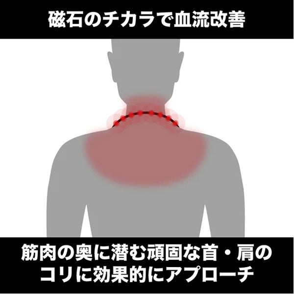 見た目の迫力に加え、名実共に超強力な磁石のチカラで肩と首のこりを緩和し、血行を促進させます。