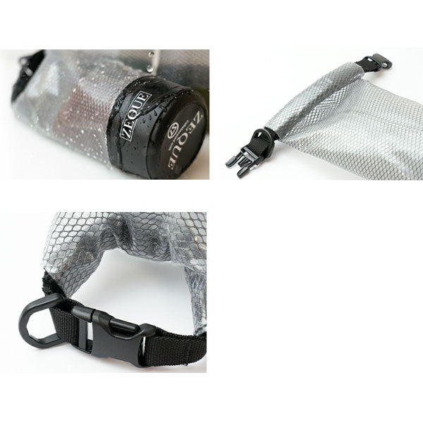 折りたたみサングラスケースやメガネクロス、スマートフォン・小さめの財布・キーケース・絆創膏などの小物を、水に濡らさずに持ち歩ける防水小物入れ。容量1Lのコンパクトサイズ。外から内容がわかる透明なクリアPVC素材。カラビナなどに簡単に取り付けられるDカン付き。【3回ロールダウンで防水性を発揮】伸ばした状態から3回ロールダウンすることで内部への浸水を防止。急な雨や船上・磯場の波しぶきから内部を保護。(防水レベル2)
