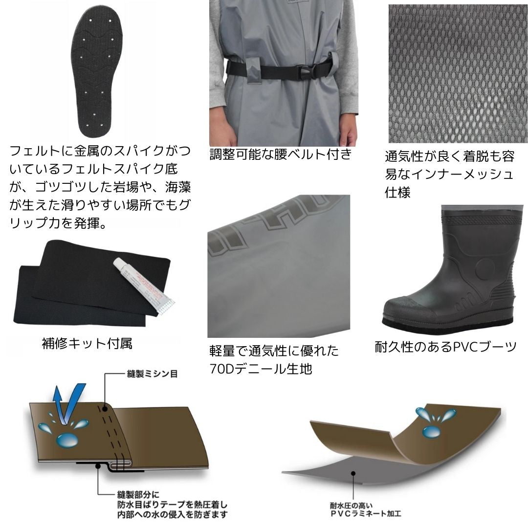 胸元まで丈があるため、深い水深から浅瀬まで、海や川など、あらゆる釣り場でオールマイティーに使用できる定番のウェーダーです。
