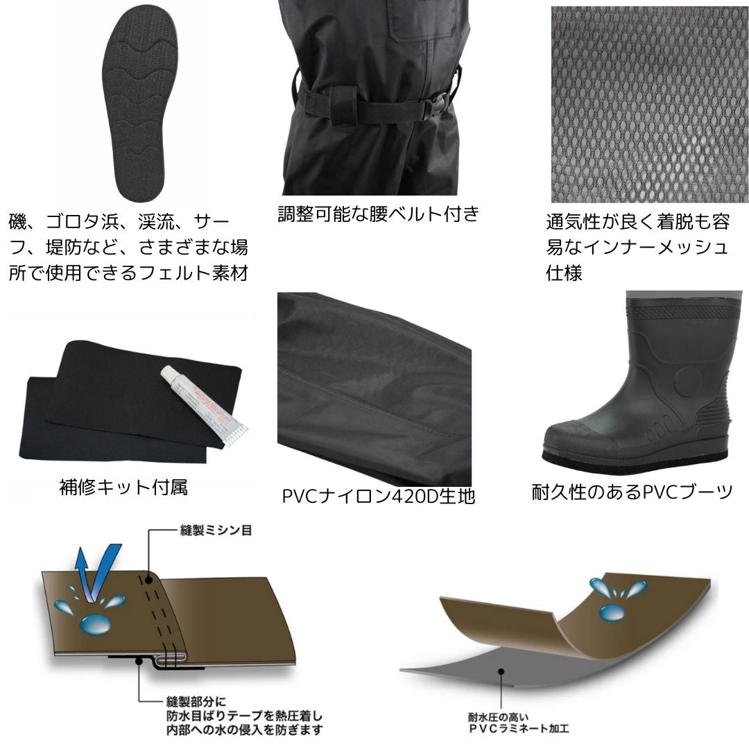胸元まで丈があるため、深い水深から浅瀬まで、海や川など、あらゆる釣り場でオールマイティーに使用できる定番のウェーダーです。