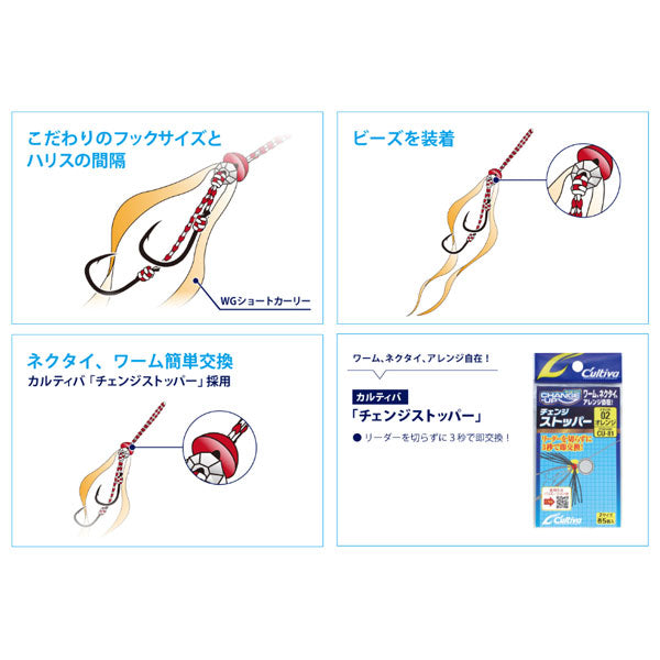 揺れや風が気になる船上でもネクタイやワームを簡単に交換できる「チェンジストッパー」に加え、ネクタイが干渉しにくいよう、ネクタイを左右に広げる効果があるビーズを搭載しました。こだわりのフックサイズとハリス間隔は理想のアクションを実現します!また、ユニットのみに採用される限定カラーも魅了的!