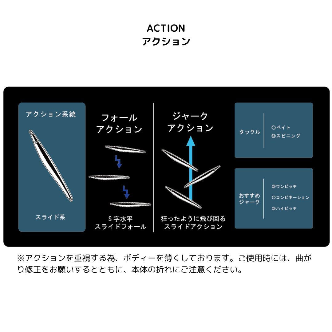 ジャーク入力時には左右へ大きなスライドアクションにより、逃げ惑うベイトの動きを演出し、フォール時にはスローなS字アクションにより、喰わせの間を演出します。リーリング時にはテール部のカット面により、フラッシングアピールと小魚の様なローリングアクションでターゲットを魅了します。