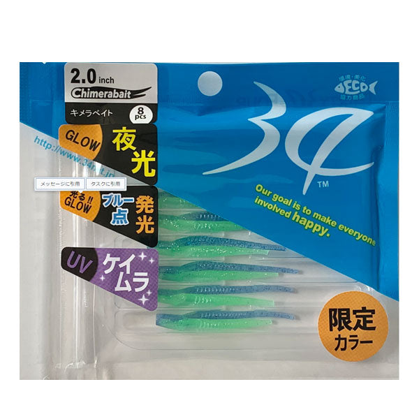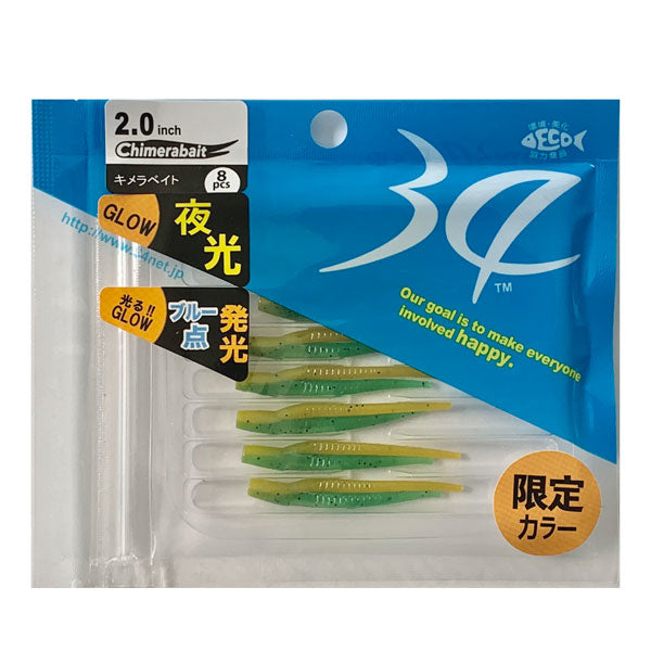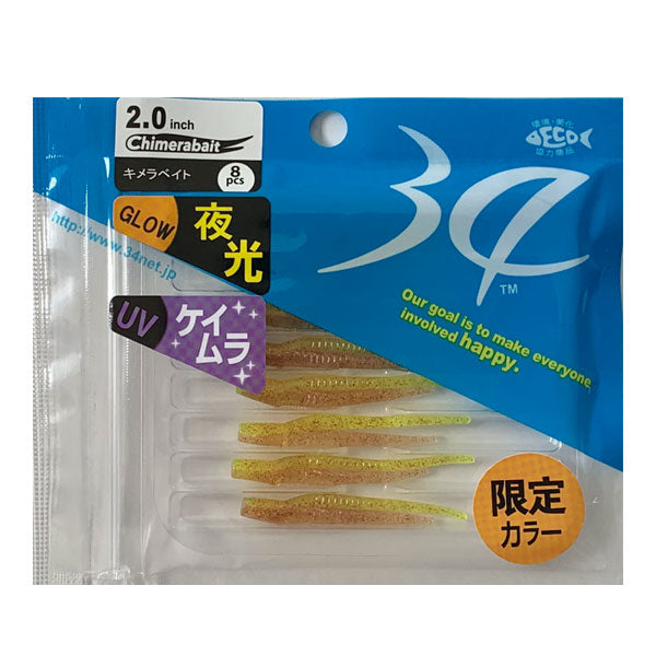 このワームを作る前に"ダブルJr."と言うのを34のフィールドガイドの米本が行っており、外房のシャローで抜群の効果を発揮していました。壱岐にて"ダブルオクトパス"はどうかと試したところ、他の人が釣れない中、ほぼ一投一匹の入れ食いになったのです。しかし、このダブル付けは非常にジグヘッドに刺す事が難しく、後から通すワームが立ってしまいました。本来は二本が重なる事が理想ですが、それが中々上手くいかず、刺し方をかなり工夫しましたが、この刺し方なら…と言うのが見つからず、釣れるがストレスが溜るという何とも言えない気持ちになってしまいました。ダブルオクトパスの利点は、ワームが増える事で体積が増し、浮力が増えスローフォールになることにあります。それ故にレンジ(棚)キープがし易くなり、重さが増す事で飛距離が増えるのです。このスローフォールの部分に着目し、今僕らがやっているスローアジングにももっと対応出来るように、下部にエアーポケットを作った事によりスローフォールを実現しました。34が開発の際にその都度行っている海に潜っての目視確認をしたところ、ボディーは余分な動きを見せていませんでした。むしろ、テールだけが左右に開く動きではなく先の方1cm位が上下に開く様に動き、細かな波動を出しているようで僕が潜っているにも拘らずアジが後ろから咥えるのが見えたのです。この「キメラベイト」は、活性が高い時、低い時に関わらずスローフォールと特異の形状でアジの目を引き、アジにとっては堪らないご馳走に見えるワームだと思います。