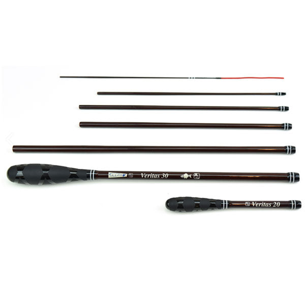 河野真二氏監修、Veritasシリーズ第二弾。Veritas20/30はVeritas40の基本性能はそのままに、ショートレングス化。関東地方の水郷地帯に多いホソや、魚の溜まる枡など、より足元での釣りに特化したモデルです。Veritas40同様、ハードティップ搭載。また、付属の20専用グリップに切り替えていただくことで、足元のゴロタに潜むタナゴやテナガエビなど、様々な魚種・シチュエーションに対応可能です。市販のカーボン製タナゴ竿に比べると、Veritasシリーズは硬い竿、という印象を受けます。しかしながら、竹製の和竿を見ていただくと、実はこの硬さが実際にはタナゴ釣りの一番の特徴ということが見えてきます。小さなタナゴと言っても、主食のエサとなるのが、岩や水の中に沈んでいる植物などに付着している藻類で、非常に丈夫です。市販されているタナゴ針では口先を貫き難いほど。このため柔らかい釣味、引き味を売りにしているタナゴ竿では、その口先に極小の針を貫く事は非常に難しいのです。ショートレングス化されたVeritas 20/30は、その硬い口先でも大合わせせずに、軽く手首を返すだけでフッキングできるロッドパワーと体の動きに合わせて即反応する俊敏なセッティングになっています。また、タナゴの魚信に対し、フッキング(アワセ)時の違いも重要です。