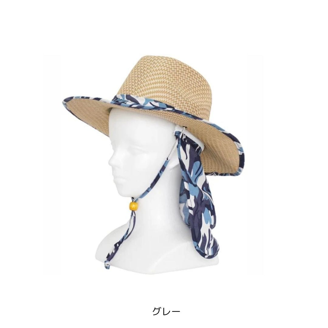 日除け布付きで首筋の日差しも気にならない麦わら帽子。 定番のカモフラ柄。 日除け布はファスナーで取り外し可能な2way仕様。 強風時にも便利な調整可能のあご紐付き。