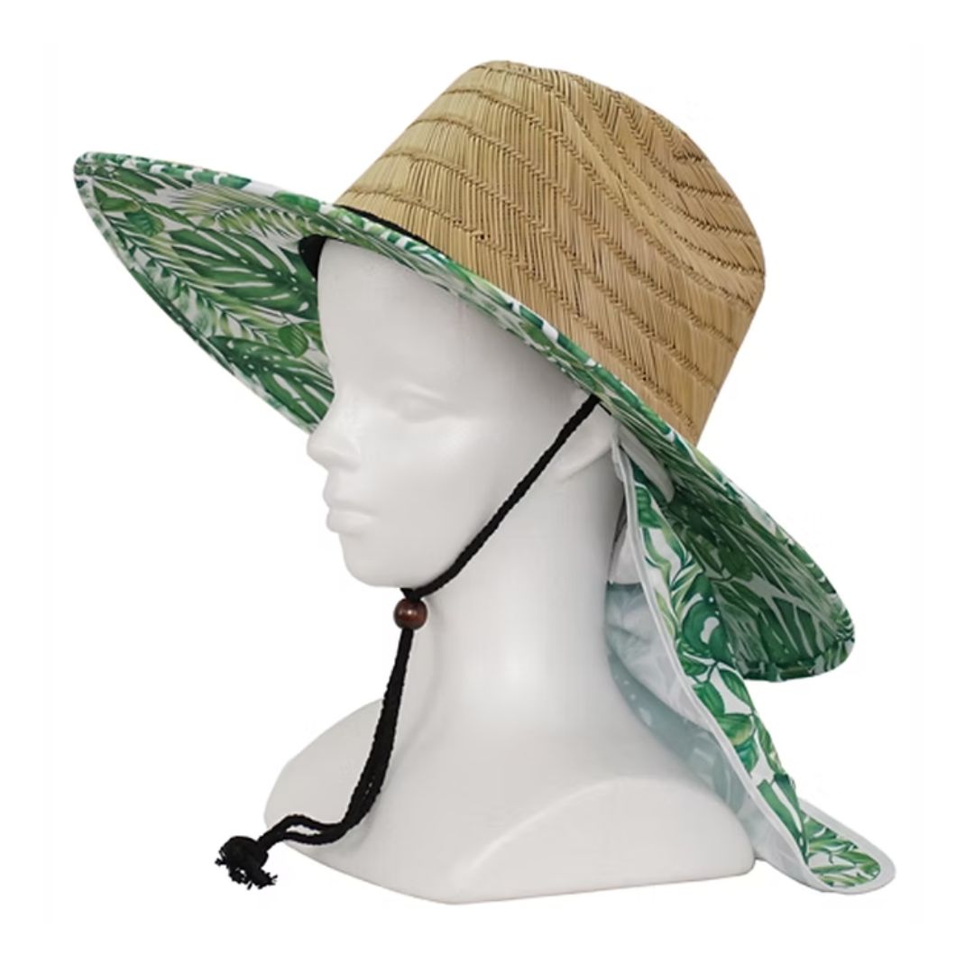 WPC-396 2wayモンステラ柄 日除け付き麦わら帽子