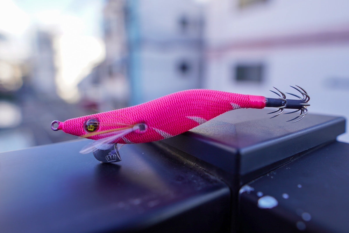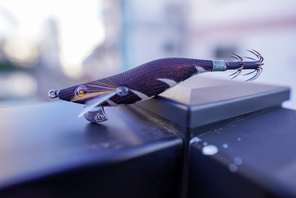 今までの実釣にて大多数のケンサキイカは下方向から追いかける傾向にあり、ならばエギのお腹側にバイトマーカーを付け、通常のエギより視認性をアップしました。