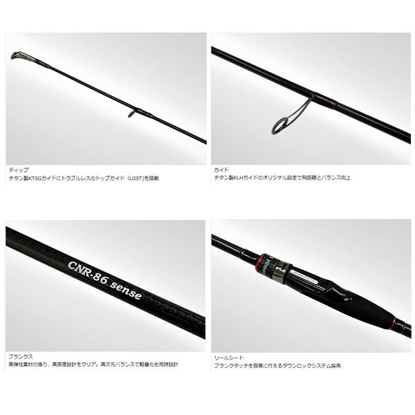 遂に復活!CN-86senseが更に進化して登場。軽さ、シャープなシャクリ感、圧倒的なパワーなど、名竿CN-86senseの良さを継承しつつ、しなやかなティップ、しっかり曲がるブランクス、さらにガイド数を増やし超高感度が実現。CNR-86senseはレギュラーテーパーでありながらスラックジャークは勿論、あらゆるシャクリに対応し、オールシーズン使用できるハイエンドモデルです。