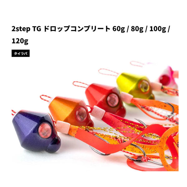 だから釣れる。釣れることだけを愚直に追求した答え。ドテラ攻略特化型ヘッド「2step TG ドロップ」 風や潮にまかせて船を流して広範囲を探るドテラ流し。バイトのチャンスが増えるというメリットの一方で、潮に流され底取りがしにくい、リトリーブ時に斜めになることでバランスが悪くなるなどのデメリットがあることもまた事実。「ドテラ流しで快適に使い切ることができれば、後1匹もう1匹を狙えるのではないか」そこで「2step TG ドロップ」はドテラ流しにおけるあらゆる状況を想定。・底取りしやすい ・アタリが取りやすい ・針掛かりが良い ・巻き重りを軽減 というドテラ流しはもちろん、どんな状況にも対応する「快適さ」を、この特殊なヘッド形状が実現しました。 100g