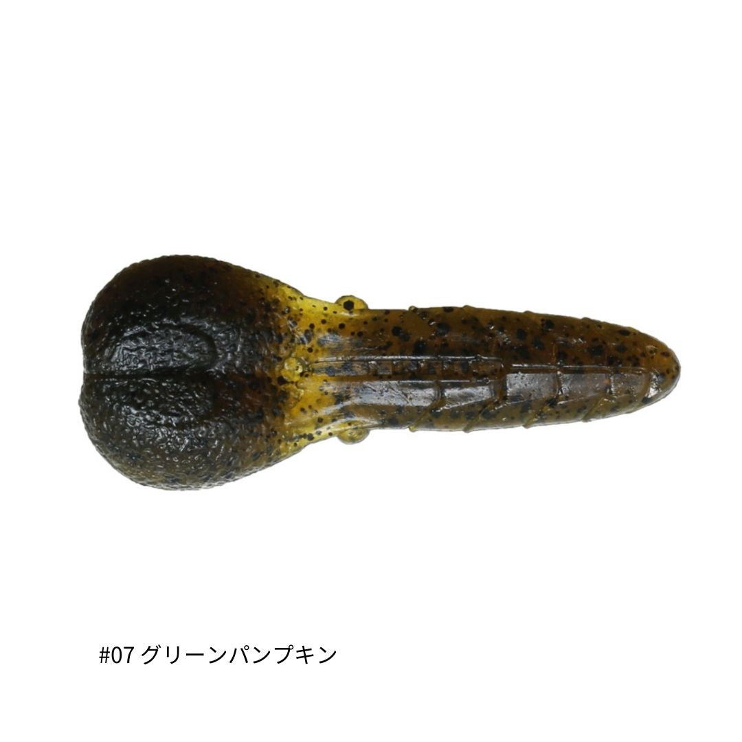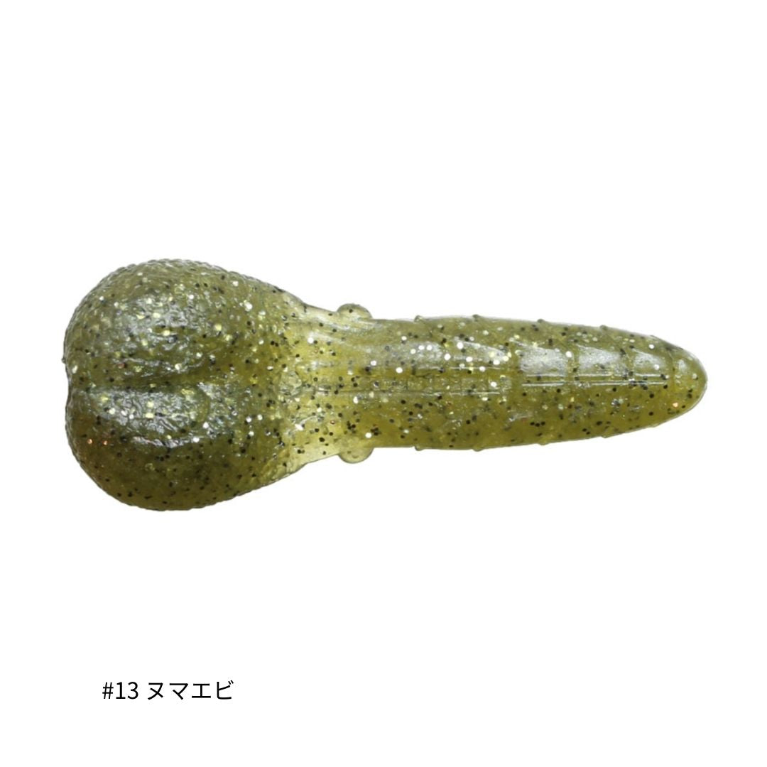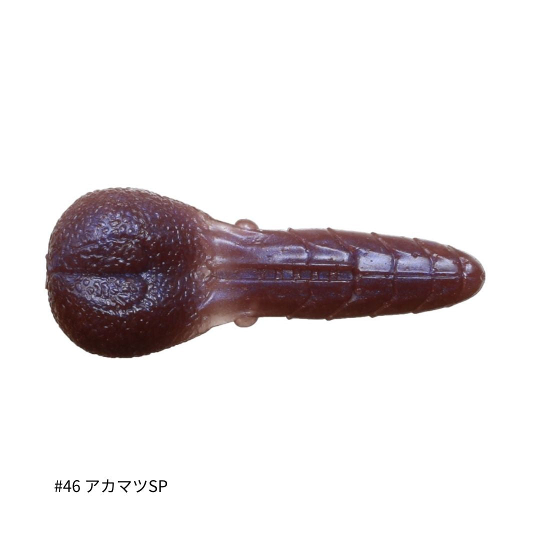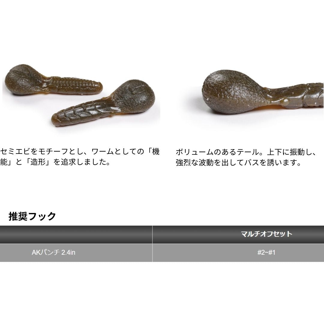 バルキーなテールが上下に振動し、強烈な波動を出してバスを誘います。 また、オフセットフックをセッティングする事で、ウッドカバーやウィードの奥でアクションさせ、 "カバーの奥で強振動を発する"今までに無い誘いが可能です。 ノーシンカーやネイルリグではロッドワークに反応してアクション、テキサスリグやフリーリグでは フォール時も振動し、独特のアクションでバイトを誘発します。