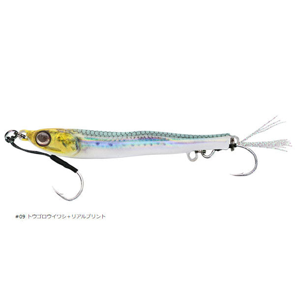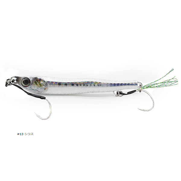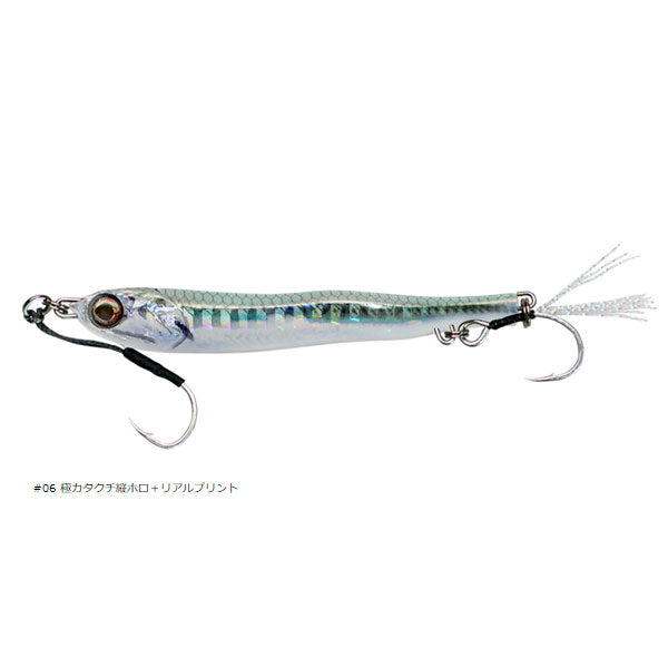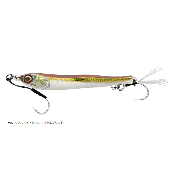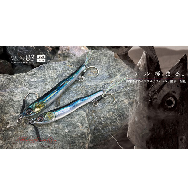 見紛うリアル。まさにベイトな動き まさにエサ!「まっすぐ」泳ぐから釣れる。カタクチイワシの泳ぐ様を再現し、アクションしない、回転しないメタルジグを開発。左右非対称湾曲ボディーがわずかに微アクションを生みながらスーッと真っすぐ動き、過剰なアピールを排除した低活性時のスレた魚、多くの人がキャストしたスレきったフィールドでも釣果をもたらします。フォール時も水平姿勢を保ちながらゆっくりとフォールし見事に弱ったイワシを演出。潮に乗せながらのリフト&フォールさせることでアプローチし、メタルジグよりもフライに近い、まさにカタクチイワシなモデルがメタルアディクト03です。また、トゥイッチやジャークで喰わせの間やパニックアクションをアングラーの意のままに、トップウォータープラグのように演出可能。更には生命感を宿した湾曲した左右非対称リアルフォルム、フォルムによる乱反射面、フォール・スイム時のシルエットでナチュラルにアピールしバイトに繋がるのも魅力です。大型フックの装着と本体により近くフックをセッティングできる、リアにアイを二つ設けた半固定の大型ティンセルフック装着システムを採用。バケや弓角のようなイメージを持ち、サイズアップした大型フックの装着とラインとフックの絡みを解消しつつ、バイトにしっかりと対応できる構造が最大の特徴です。通常リアフックに用いられるトレブルフックよりも懐が深く、サイズアップしたフックを本体近くにキープすることにより快適な使用感とフッキングの良さを両立しています。また、リアフックを外すことによりメタルジグライクな左右のイレギュラーアクションも可能です。低活性時、スレたターゲット攻略にも威力を発揮する見紛うリアル、METAL ADICT 03。バイトに直結するリアルをメタルジグに注入しています。