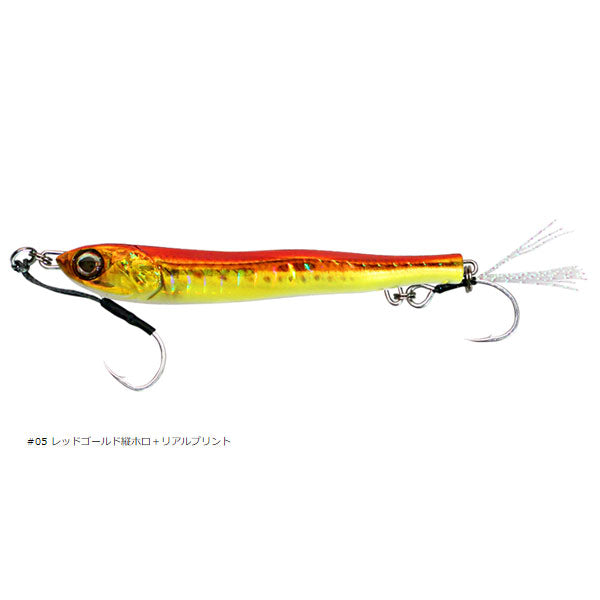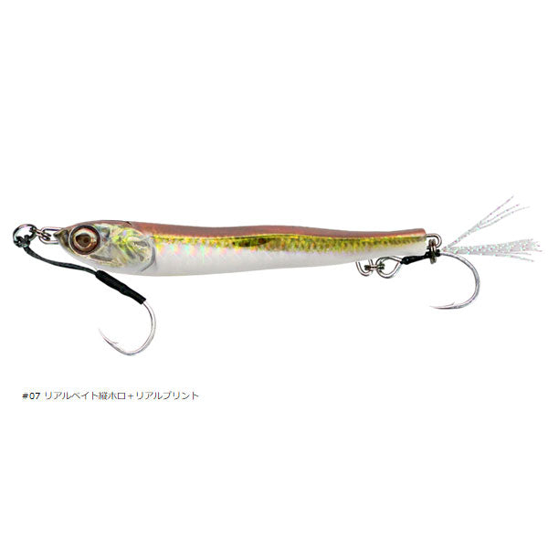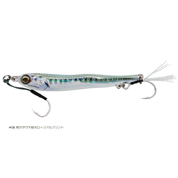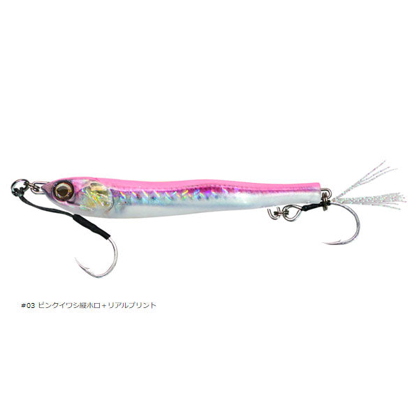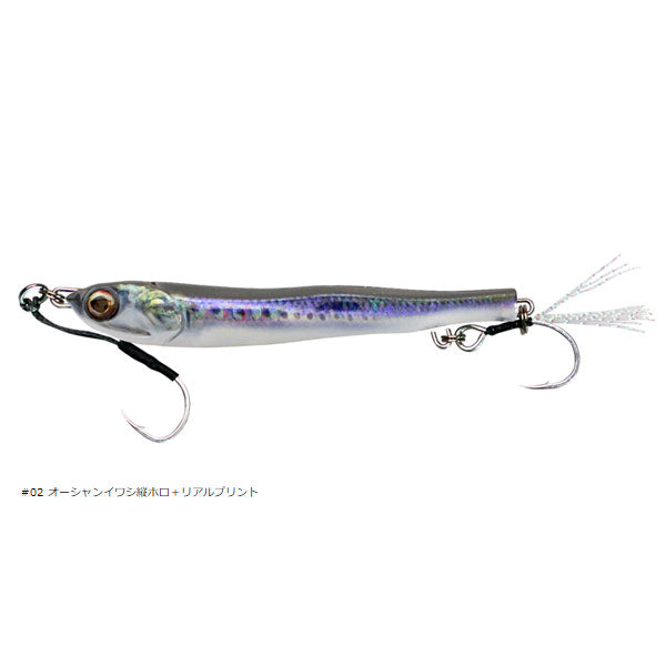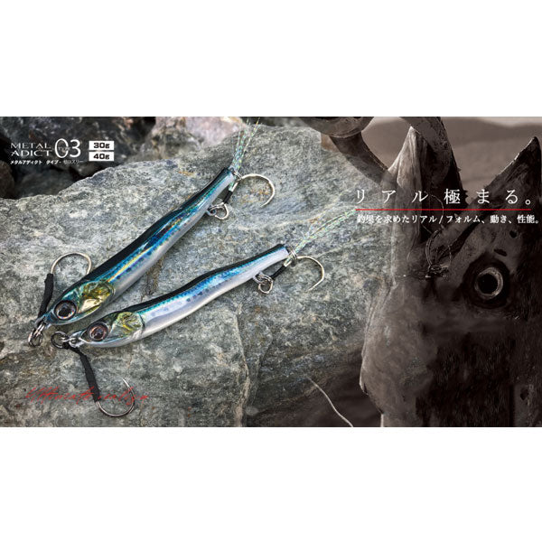 見紛うリアル。まさにベイトな動き まさにエサ!「まっすぐ」泳ぐから釣れる。カタクチイワシの泳ぐ様を再現し、アクションしない、回転しないメタルジグを開発。左右非対称湾曲ボディーがわずかに微アクションを生みながらスーッと真っすぐ動き、過剰なアピールを排除した低活性時のスレた魚、多くの人がキャストしたスレきったフィールドでも釣果をもたらします。フォール時も水平姿勢を保ちながらゆっくりとフォールし見事に弱ったイワシを演出。潮に乗せながらのリフト&フォールさせることでアプローチし、メタルジグよりもフライに近い、まさにカタクチイワシなモデルがメタルアディクト03です。また、トゥイッチやジャークで喰わせの間やパニックアクションをアングラーの意のままに、トップウォータープラグのように演出可能。更には生命感を宿した湾曲した左右非対称リアルフォルム、フォルムによる乱反射面、フォール・スイム時のシルエットでナチュラルにアピールしバイトに繋がるのも魅力です。大型フックの装着と本体により近くフックをセッティングできる、リアにアイを二つ設けた半固定の大型ティンセルフック装着システムを採用。バケや弓角のようなイメージを持ち、サイズアップした大型フックの装着とラインとフックの絡みを解消しつつ、バイトにしっかりと対応できる構造が最大の特徴です。通常リアフックに用いられるトレブルフックよりも懐が深く、サイズアップしたフックを本体近くにキープすることにより快適な使用感とフッキングの良さを両立しています。また、リアフックを外すことによりメタルジグライクな左右のイレギュラーアクションも可能です。低活性時、スレたターゲット攻略にも威力を発揮する見紛うリアル、METAL ADICT 03。バイトに直結するリアルをメタルジグに注入しています。