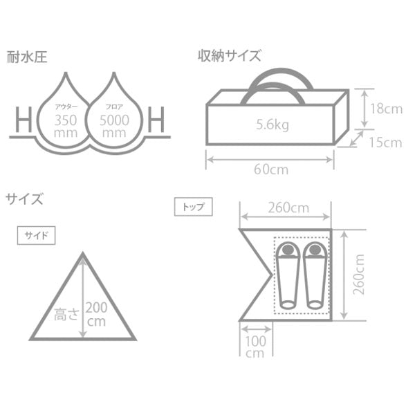 最低耐水圧 アウターテント:350mm フロア:5000mm