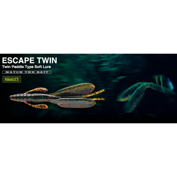 「エスケープ ツイン」 メリハリの効いた動きに、ボリュームによる“強い”アピール効果を持たせたのが「エスケープツイン」ボリュームアップした各パーツは全てストレート系水押し形状。これによりフォールやリフトなどではスパッと動いてリアクションを誘い、着底の瞬間やシェイクでは各パーツが水を大きくかき乱し、強い存在感でアピールします。中でも特徴的な2枚の分厚いパドルは、アクション中はもちろんフォールやただ巻きでも上下に大きくウォブリングして他に無いアピールを見せます。全体としてのシルエットは標準的なザリガニに合わせた喰わせサイズ。高比重素材に混ぜ込んだ塩と、味と匂いの粒子がさらに喰い込みを確実にします。使い方は杭やブッシュなどのカバー直撃テキサス。ブレイクやハンプ狙いのキャロライナ。ビッグフィッシュ狙いのラバージグトレーラーとしてもベストマッチ。勝負の早い”強い”ソフトベイトの釣りに欠かせないワームです。