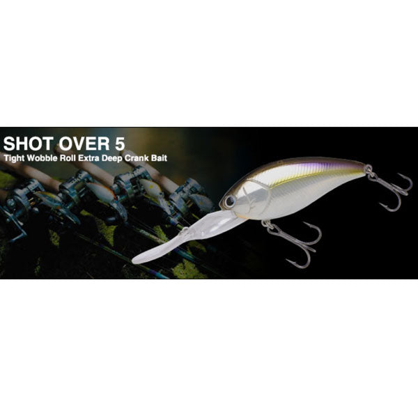 「ショット オーバー 5(ファイブ)」 ハードベイトの潜行深度としてはほぼ限界と言える水深5mをオーバー。しかもその水深をドラッギングやニーリングではなく、通常のキャスティングでトレースできる優れた潜行能力を持つディープクランクが「ショット オーバー5」です。「オーバー4(トリプルフルサイズ)」と同じ75mmのボディでありながら14lbラインで5.4m、10lbでは6.0mへ到達させることが可能。さらにボディサイズを抑えたことで巻き抵抗も低減し、広大なエリアでも引き続けられる軽いリトリーブ感を獲得しています。もちろん「オーバー4」同様に、安定姿勢でロングキャストを可能にするキャスティングフィンを採用し、ウィードやソフトボトムへの刺さりを低減するノンスタックビル仕様。アクションは水質を選ばないオールコンディション対応を狙ったタイトウォブルロール。しかもボディとリップとを別成型し組み合わせる構造を採用し、カラーによってボディマテリアルをボーンホワイト系ABSとクリア系ABSを使い分け、これによりカラーに伴ってアクションやサウンドの差も生まれ、アピールの強弱という引き出しをさらに広げます。効率の良い釣りがしにくいディープウォーター攻略の中で、圧倒的にスピーディーな展開が可能なディープクランキング。その優位性が「ショット オーバー5」でさらに際立ちます。
