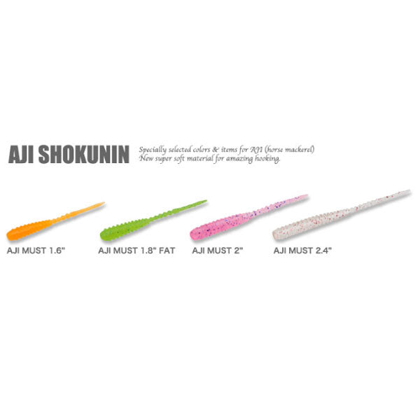 「アジ職人 アジマスト」アジングでは絶対に欠かせないマストルアー、その名も「アジ職人 アジマスト」。ボディをわずかに扁平にすることで、アジが好むスライドフォールを実現。ボディ、テールそれぞれにデザインされたリブが、極めてベイトライクな微波動を生み出します。さらに、アジが吸い込んだ時にしなやかに折れ曲がる極細テールデザインにより、フッキング率を大幅に向上。もちろん、喰い渋ったアジすらバイトへと導く“味と匂い”もバッチリ大量配合。アジングに特化したギミックをとことん詰め込んだ渾身のアイテムです。 1.8″ファット アクションレスポンス、視覚的ボリューム、適度な水噛み、バイトを弾かないスムーズな吸い込みなど、アジングワームに求められる要素を高次元にバランス。積極的な攻めのゲーム展開に打ってつけの、アピールとクワセを兼ね備えたアイテム。