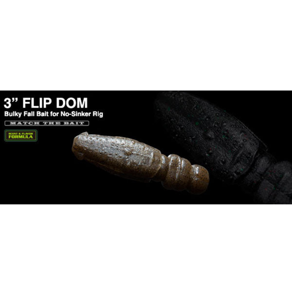 「3" フリップドム」タフコンディション下のバスをもバイトに持ち込むことができるフォールベイトが「フリップドム」。甲殻類を思わせる独特のシェイプは、ノーシンカーでの水平フォール姿勢を維持し、フォール時には左右に揺れながら自発的なアクションを生むバランスを追求してデザイン。また、フックポイントをしっかりホールドできるデザインにより、スナッグレス性を大幅に向上させています。ワーム単体で約14gと重さを持たせてあるため、MHクラスのパワーロッドでも容易に操作可能。幾重にも折り重なるブッシュやカバーの奥までもスキッピングで送り込み、そのアクションでバスを陥落させることができるアイテムです。