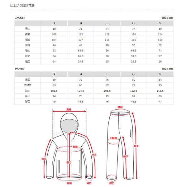 雨・風を防ぎ釣りを快適にする透湿性に優れたスタンダードレインスーツ れた透湿性・防風性・耐水性を兼ね備えた3層レイヤー生地で、雨の日でも快適に釣りができるスタンダードレインスーツです。生地は透湿性があるため(透湿度20,000g/m2/24hr)、汗による蒸れを軽減し、べたつきを抑え快適な着心地が持続します。耐水圧は20,000mmとなっており、雨の中の釣りでも安心です。ミドル生地の透湿防水フィルムには防風性があり、外部からの冷たい空気の侵入を防ぎます。腕の上げ下げをスムーズに行える立体設計により、釣りの動作を妨げず裾のずり上りを軽減しました。ワンタッチでフードの調整が可能なアジャスター付き。袖口、ジャケット裾、ズボンの裾にも絞り用のドローコードがついており、裾幅の調整が可能です。裾を体にフィットさせることで雨や風の侵入を軽減します。フロントファスナーには小型のホイッスルが付属し、緊急時にも役立ちます。※各カラー共通でブラックのパンツがセットになっています。