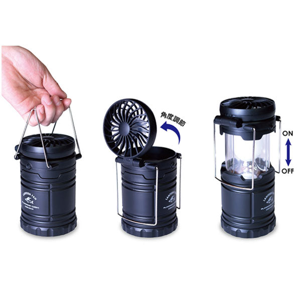ファン付のランタン 扇風機が付いたのコンパクトランタン。ランタンは上に引くだけで点灯するスライドスイッチを採用。スライドの位置によって光量の調整が可能。3WのCOBLEDライトが360度の範囲で明るく照らします。扇風機は本体側面のファンスイッチを押してON/OFF切替え。角度調節可能。フックでかけて使用できます。夜釣りはもちろん、アウトドア・防災などにも最適で小型ランタン。