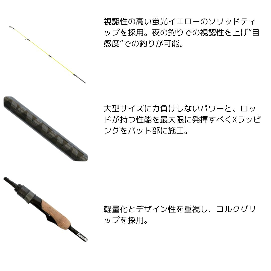 パチンコアジングに特化した性能を詰め込んだ1本。<br>バランスが良く軽量化されたブランクスは持ち重りを感じることなく常に魚のアタリに集中することができます。また明確にアタリを手元まで伝達する感度と、竿先の微々たる変化でアタリをとれるように視認性抜群の蛍光イエローカラーのソリッドティップを採用し、手感度と目感度を併せ持つ仕様に仕上げました。<br>グリップエンドには、必要に応じて長さを変更することができるEGM(エクステンドグリップメカニズム)を採用し、アジが浮いたタイミングなどで即座にジグヘッド単体モードに変更することができ、様々なシーンを楽しめる1本となっております。