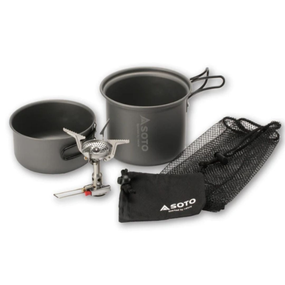 トータルバランスに優れたコンパクトストーブ、SOTOシングルストーブ AMICUS(アミカス)とアルミクッカーのセット。