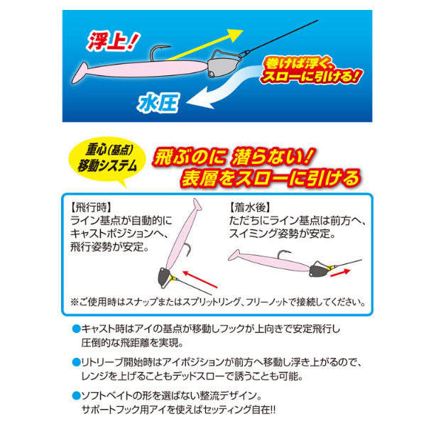 ●ソフトベイトの形を選ばない整流デザイン。サポートフック用アイを使えばセッティング自在!!