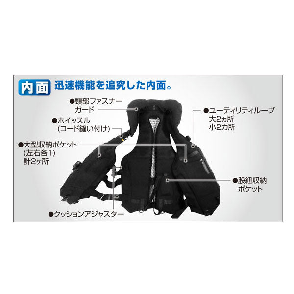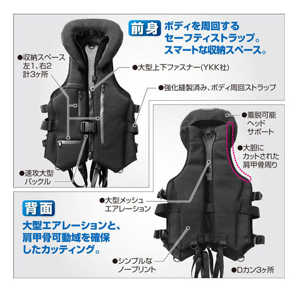 継承される「安全性」×「機能性」さらに「快適性」を備え登場です。安全性と機能性を犠牲にすることなく、適正化されたエアレーションが、軽量・高浮力フレックス素材との相乗効果で、圧倒的なキープキャストパフォーマンスをお約束します。すべては「投げ続ける」ショアの基本を結実させるための疲労軽減モデルです。※素材そのものが高い浮力を有し、【 7,5キロ/24時間 】を継続します。※ボディプロテクター2との比較では、約70ミリショート丈です。【前身】ボディを周回するセーフティストラップ。スマートな収納スペース。・大型上下ファスナー(YKK社)・速攻大型バックル・強化縫製済み、ボディ周回ストラップ・収納スペース左1、右2 計3ヶ所 【背面】大型エアレーションと、肩甲骨可動域を確保したカッティング。・着脱可能ヘッドサポート・大胆にカットされた肩甲骨周り・Dカン3ヶ所・シンプルなノープリント・大型メッシュエアレーション 【内面】迅速機能を追究した内面。・ホイッスル(コード縫い付け)・大型収納ポケット(左右各1)計2ヶ所・ユーティリティループ大2ヵ所、小2カ所・股紐収納ポケット・頸部ファスナーガード・クッションアジャスター