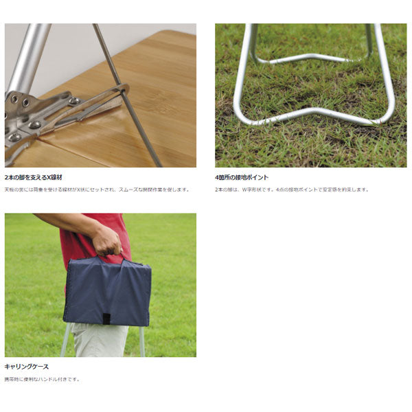 持ち運びも簡単だから、自分の好きな場所で、風景やお酒を楽しめます。焚火を前にローチェアやtake!チェアに腰掛けて、贅沢なキャンプシーンを味わってみませんか。天板には環境負荷の少ない竹を使用。抜群の安定性と清潔感あるデザインも魅力です。※LV-034Tに比べ生産背景の変更により色味が変更となっております。 Features