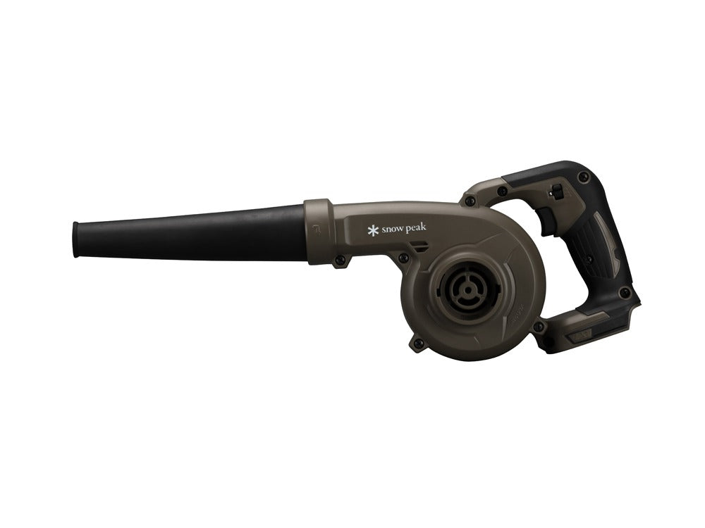 リチウムイオンバッテリー(別売り)対応のブロワ。火おこしやテントの水滴飛ばしだけでなく、先端を吸気口に付け替えれば、簡易掃除機としてインナーテント内のゴミを吸うことができます。色はテント内にあっても違和感のない落ち着いた配色となっています。小さいながらも風量があるブロワです。