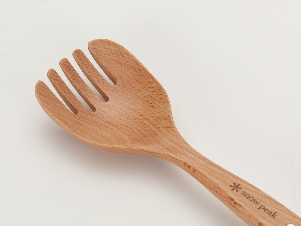 キッチンツールセットと同様に木材とステンレスを使用したサーバーフォークです。フックはIGTのレールに引っ掛けることができます。角のRがHOME&CAMPクッカーなどの角に沿った形で料理を残さず掬い取ることができます。キャンプシーンに限らず、家でも使いたくなる一本です。